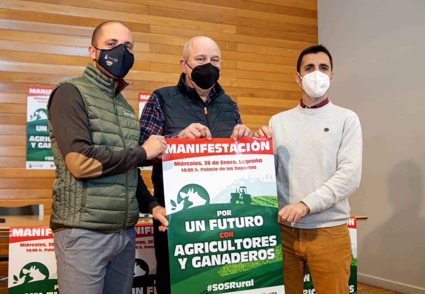 Las tres organizaciones profesionales agrarias (ARAG-ASAJA, UAGR-COAG y UPA Rioja) han convocado una gran manifestación el próximo miércoles, 26 de enero, con la que esperan “movilizar a todo el campo riojano para reclamar futuro y rentabilidad” para un sector que representa el 6,8% del PIB de La Rioja, frente al 3,1% nacional.