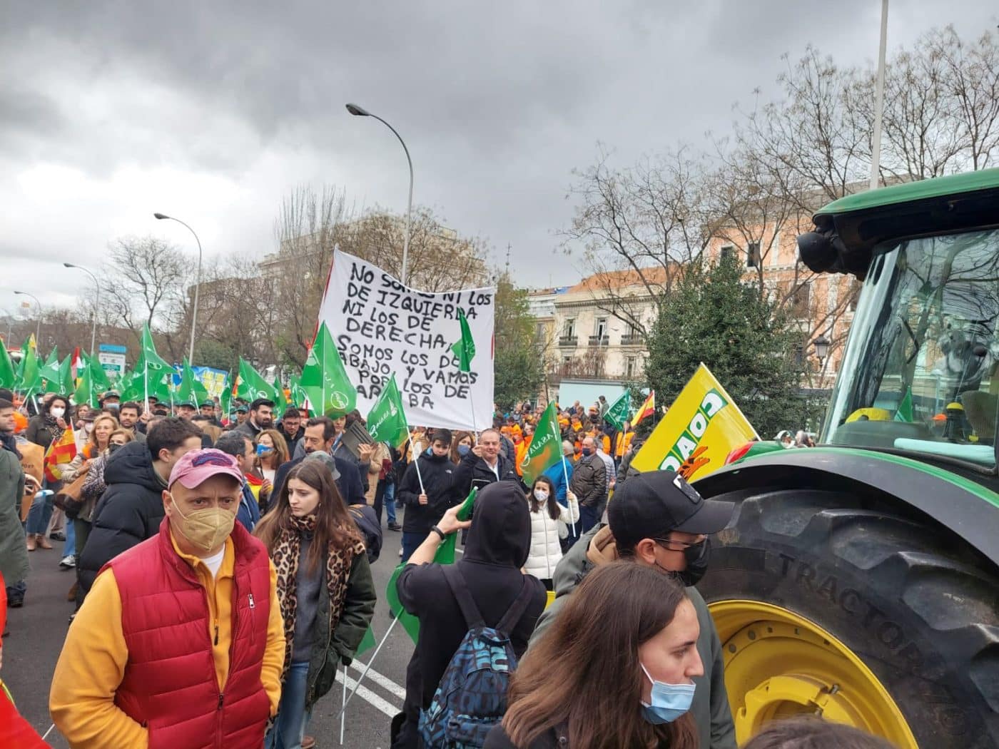 La manifiestación, la más multitudinaria organizada por el campo desde la pandemia, había sido convocada por las principales organizaciones agrarias, ASAJA, COAG y UPA, pero se han sumado también cazadores y taurinos, con sus propias reivindicaciones, sobre todo en contra de la ley del bienestar animal, y también han asistido representantes del PP y de VOX. “Se echa la culpa a la guerra, pero esto ya venía de antes”, comentaban manifestantes durante la marcha.