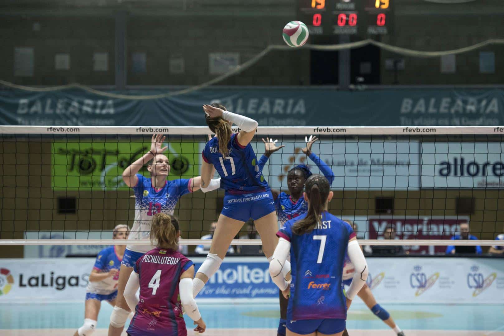Duelo entre canarias y jarreras que arrancó igualado (9-9). La labor en bloqueo de las jugadoras de Alberto Avellaneda funcionaba a pesar de la envergadura de las jugadoras del Sanaya. Con un gran saque de Aida Etxebarria, las azules cogieron mínima ventaja en el luminoso (14-15) y un bloqueo de Marta Hurst amplió esa ventaja a dos puntos.