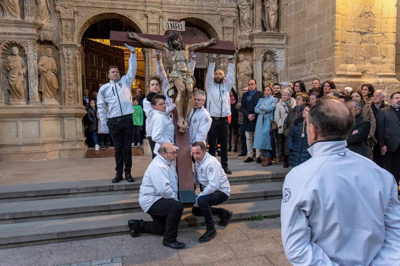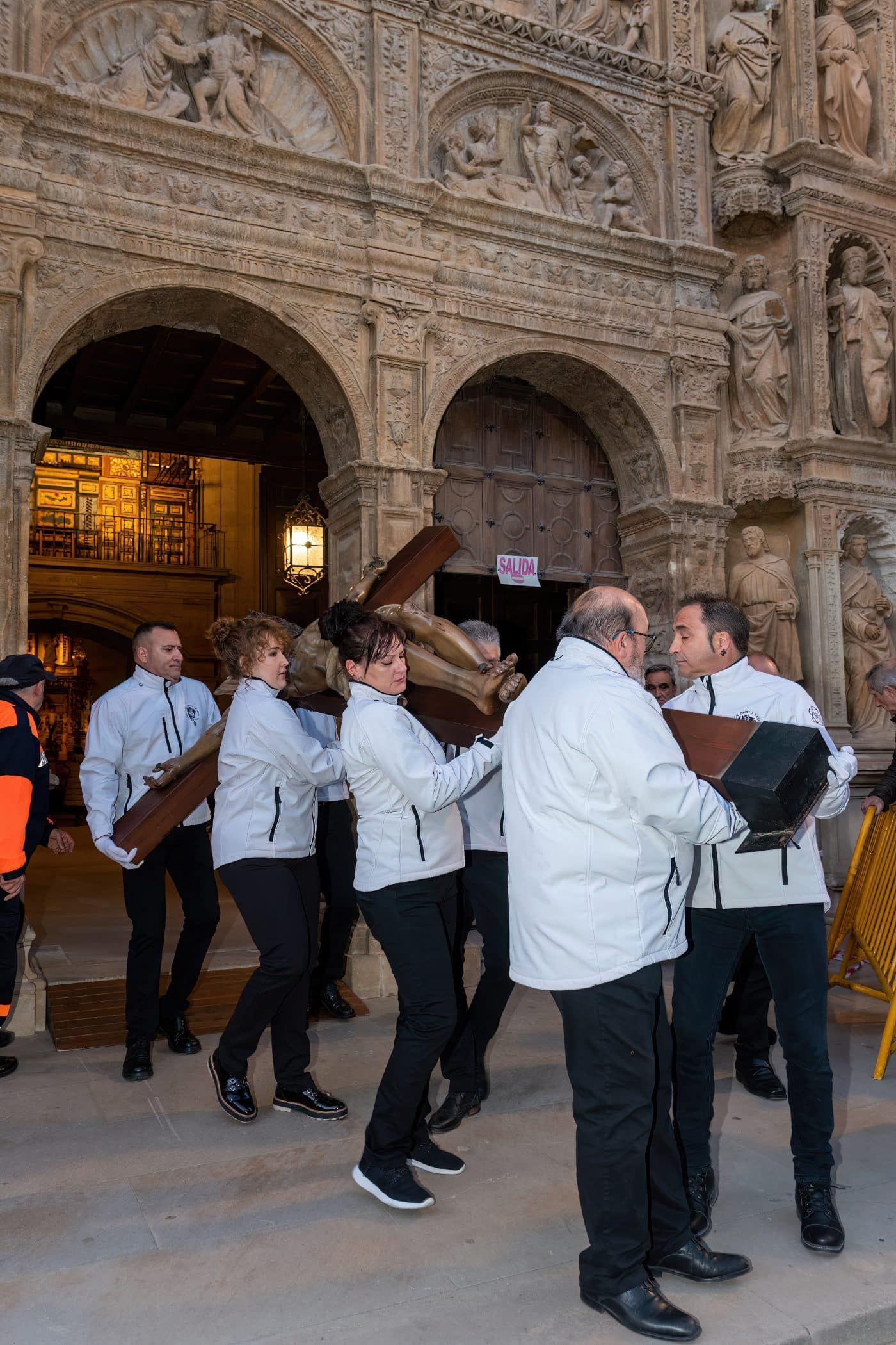 Tras el pregón, el interés del público se ha trasladado al exterior con el Traslado del Cristo Yacente.