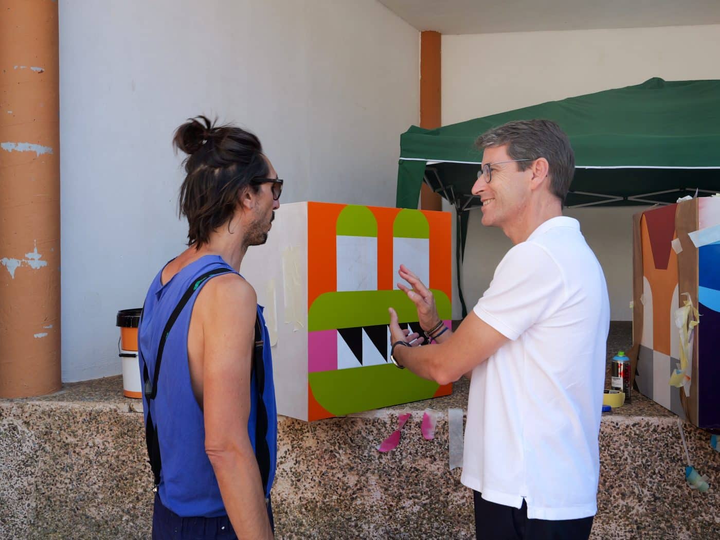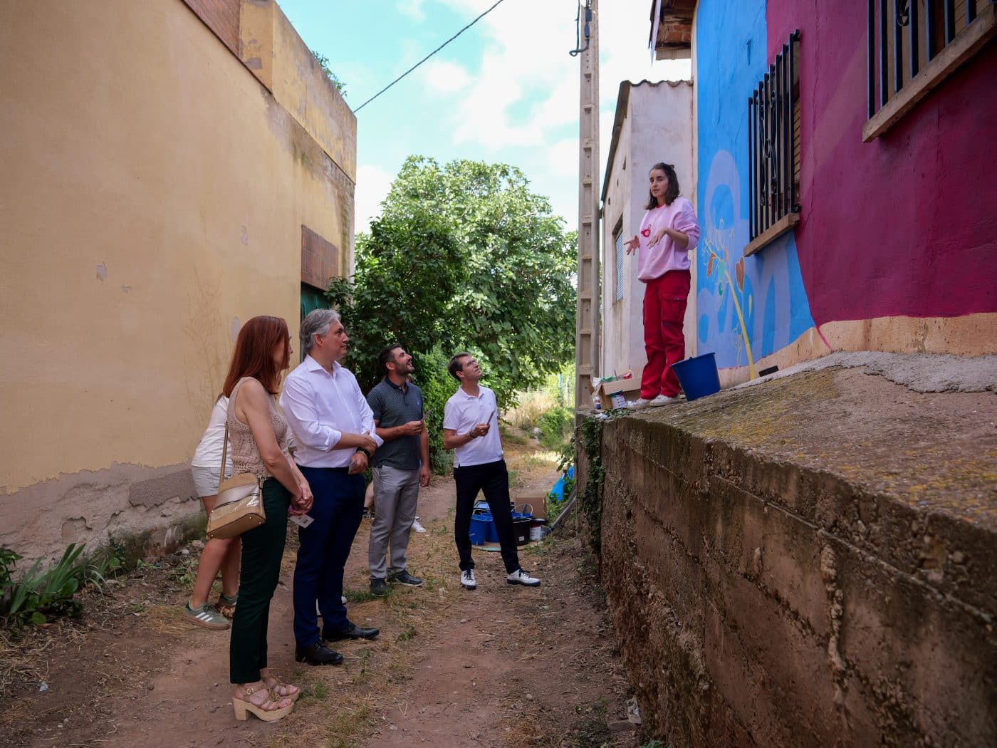 Capellán ha podido recorrer todas las intervenciones que se están creando y descubrir el objetivo y la evolución de cada obra de la mano de los propios artistas. Así, tras este festival un enorme paisaje otoñal de colores rojizos, ubicado en la fachada del primer edificio de Camprovín, recibirá a vecinos y visitantes gracias a la obra de Rafael Pérez. Ya incorporado al callejero de la localidad, los visitantes podrán disfrutar de la obra de ‘Dos monos rojos’. Como han relatado las propias artistas, Ana y Paula, el mural refleja la evolución del dibujo a lo largo de la vida humana, desde los garabatos infantiles hasta los de la vejez, mostrando un ciclo de expresión universal y haciendo un colorido homenaje al carácter artístico de Camprovín.