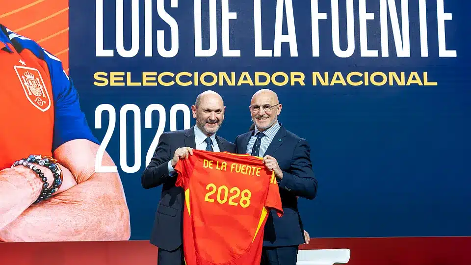 La Real Federación Española de Fútbol (RFEF) ha presentado oficialmente este lunes el acuerdo de renovación con Luis de la Fuente, que seguirá al frente de la Selección Española hasta 2028. “Sin este grupo de amigos y familia hubiera sido imposible. Son muy sabios y saben mucho de fútbol, los necesito para estar a la altura de la exigencia”, ha dicho el técnico jarrero antes de inmortalizarse junto a su cuerpo técnico.