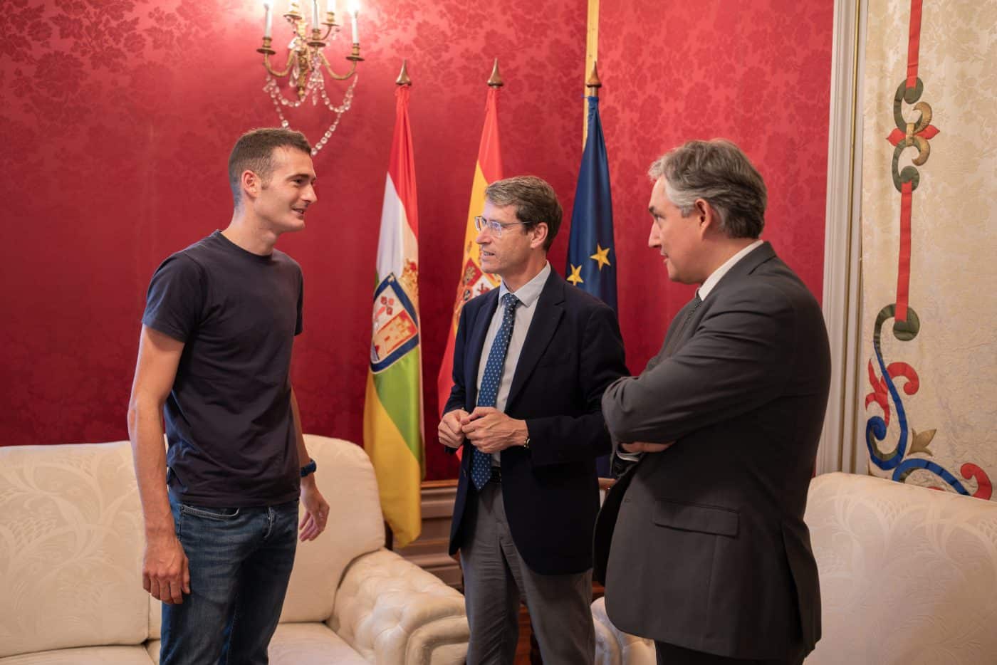El presidente del Ejecutivo riojano, Gonzalo Capellán, y el consejero de Cultura, Turismo, Deporte y Juventud, José Luis Pérez Pastor, han recibido esta tarde en la sede del Gobierno de La Rioja al corredor riojalteño Alain Santamaría tras lograr cuatro medallas en el Campeonato de Europa de Skyrunning, celebrado el fin de semana del 14 al 16 de julio en Montenegro.