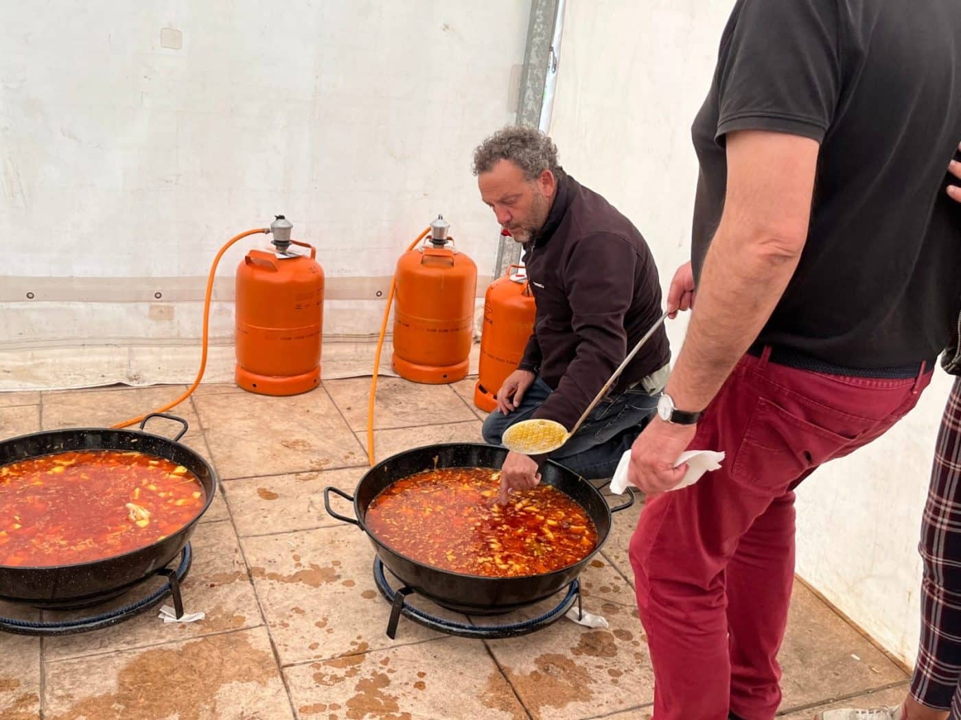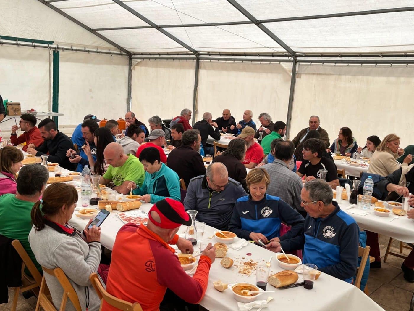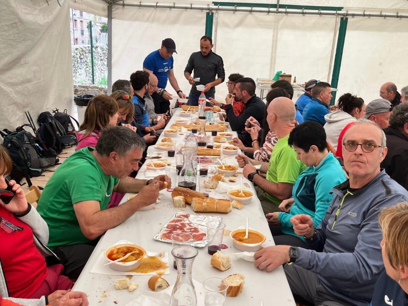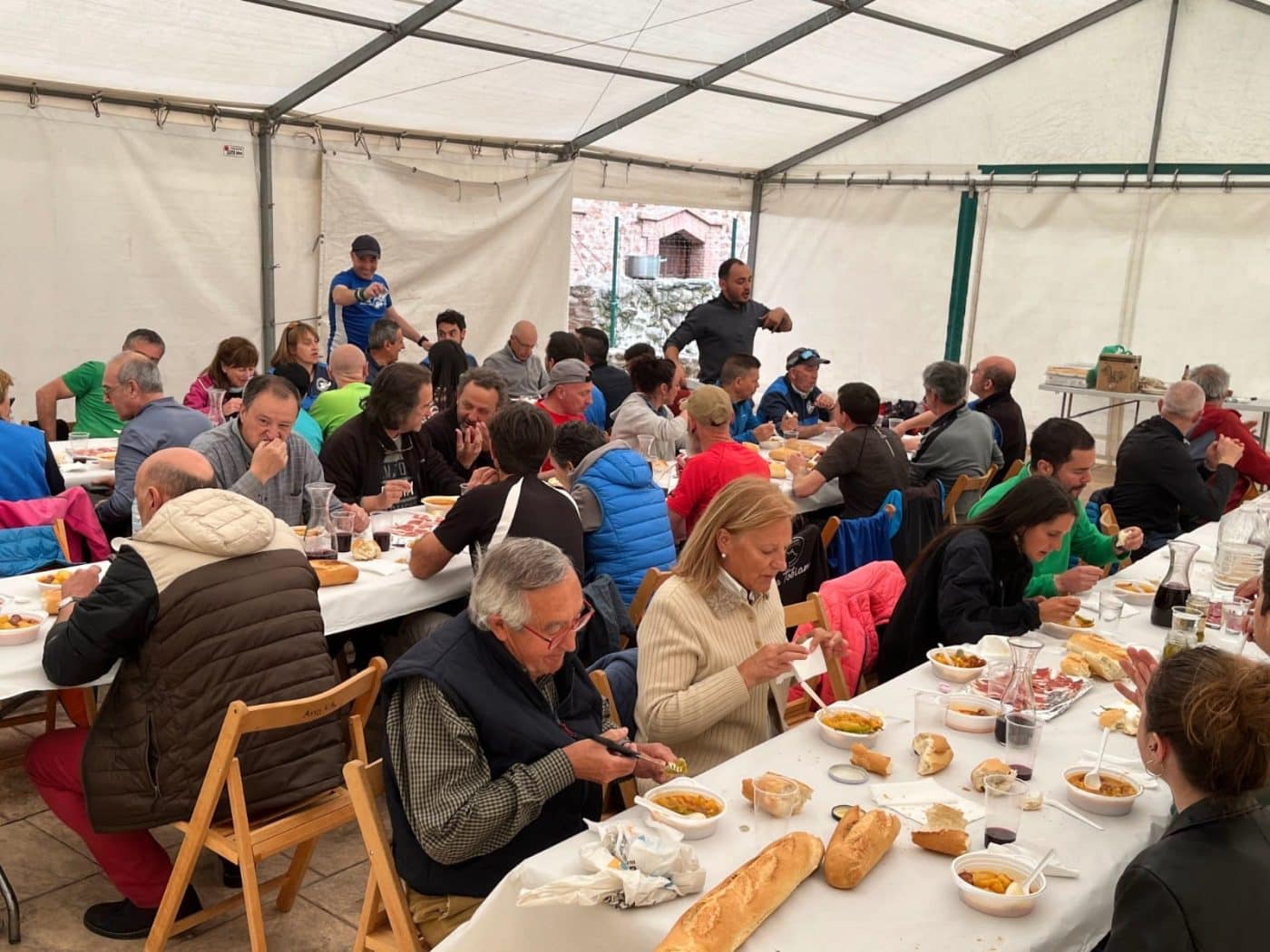 A las 15:00, los montañeros y los habitantes de Viniegra prepararon dos cazuelas de patatas con chorizo, acompañadas de un buen vino local, y dos deliciosas tartas de chocolate para los comensales.