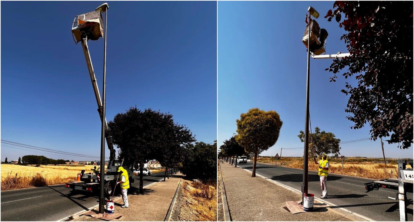 En los últimos días se ha iniciado el pintando de las columnas y brazos de las luminarias de la ciudad en distintos puntos de la localidad. En concreto, los operarios están pintando, de color granate, todos los elementos ubicados en la zona de El Mazo, en los parques ubicados en el mismo área, zonas cercanas a la plaza de Toros y en avenida de Logroño.