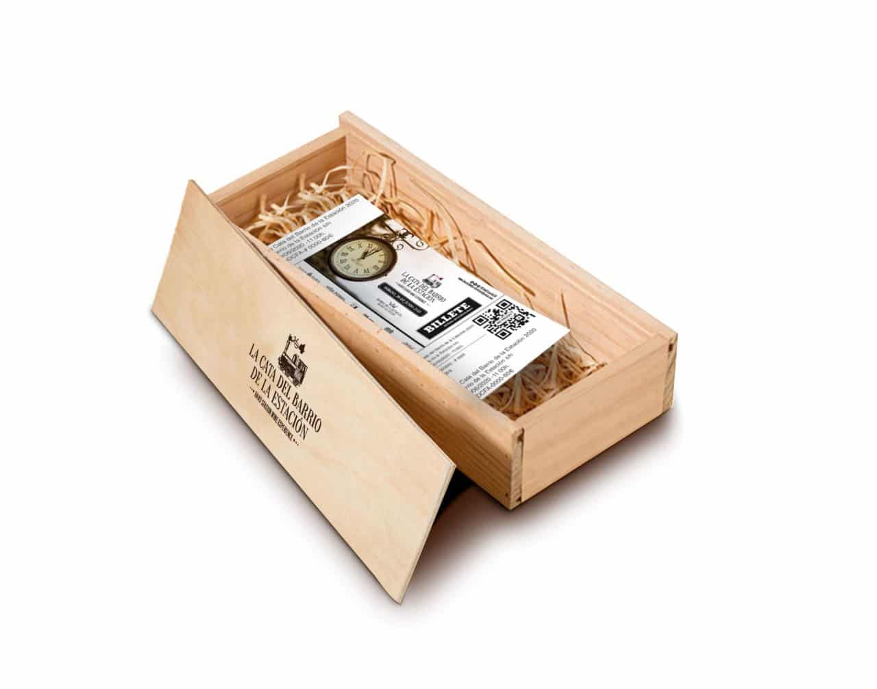 El regalo más sofisticado llega en una bonita caja de madera, similar a las de las botellas de vino, donde se encuentran, en su interior, las entradas para asistir a La Cata del Barrio de la Estación. Cada entrada permite el acceso al Barrio de la Estación, la degustación de doce vinos de prestigio (dos por bodega), degustaciones típicas riojanas y mucho más. Todo ello, se podrá adquirir a través de la página web oficial del evento por el precio de 90,00 euros.