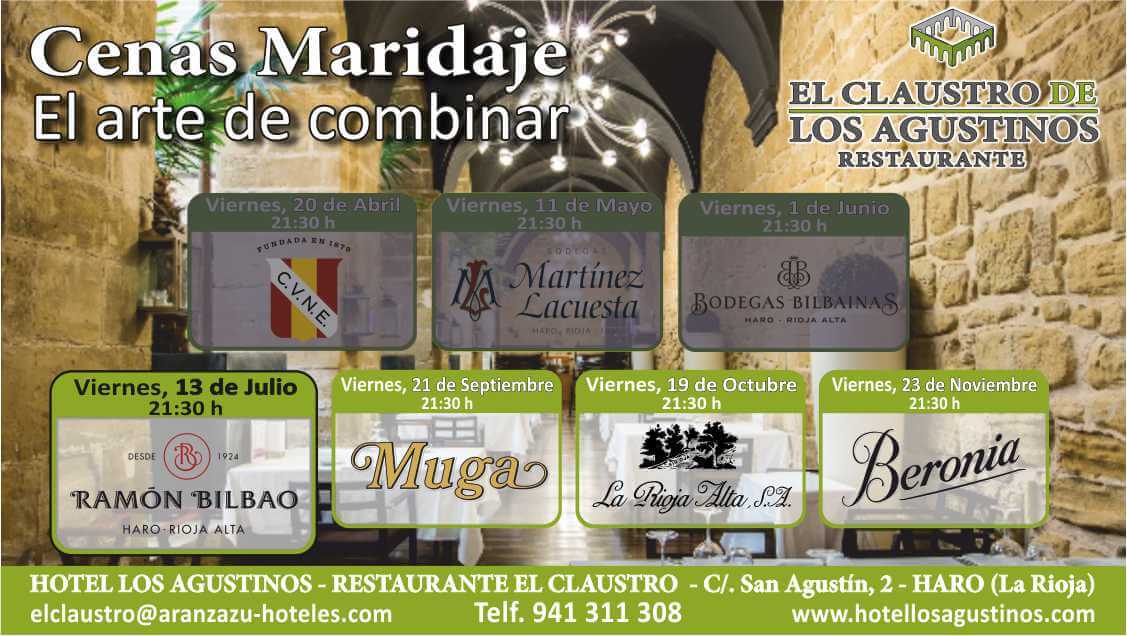 Continúan este viernes 13 de julio las Cenas Maridaje del restaurante El Claustro de Los Agustinos con los vinos de Ramón Bilbao como grandes protagonistas.