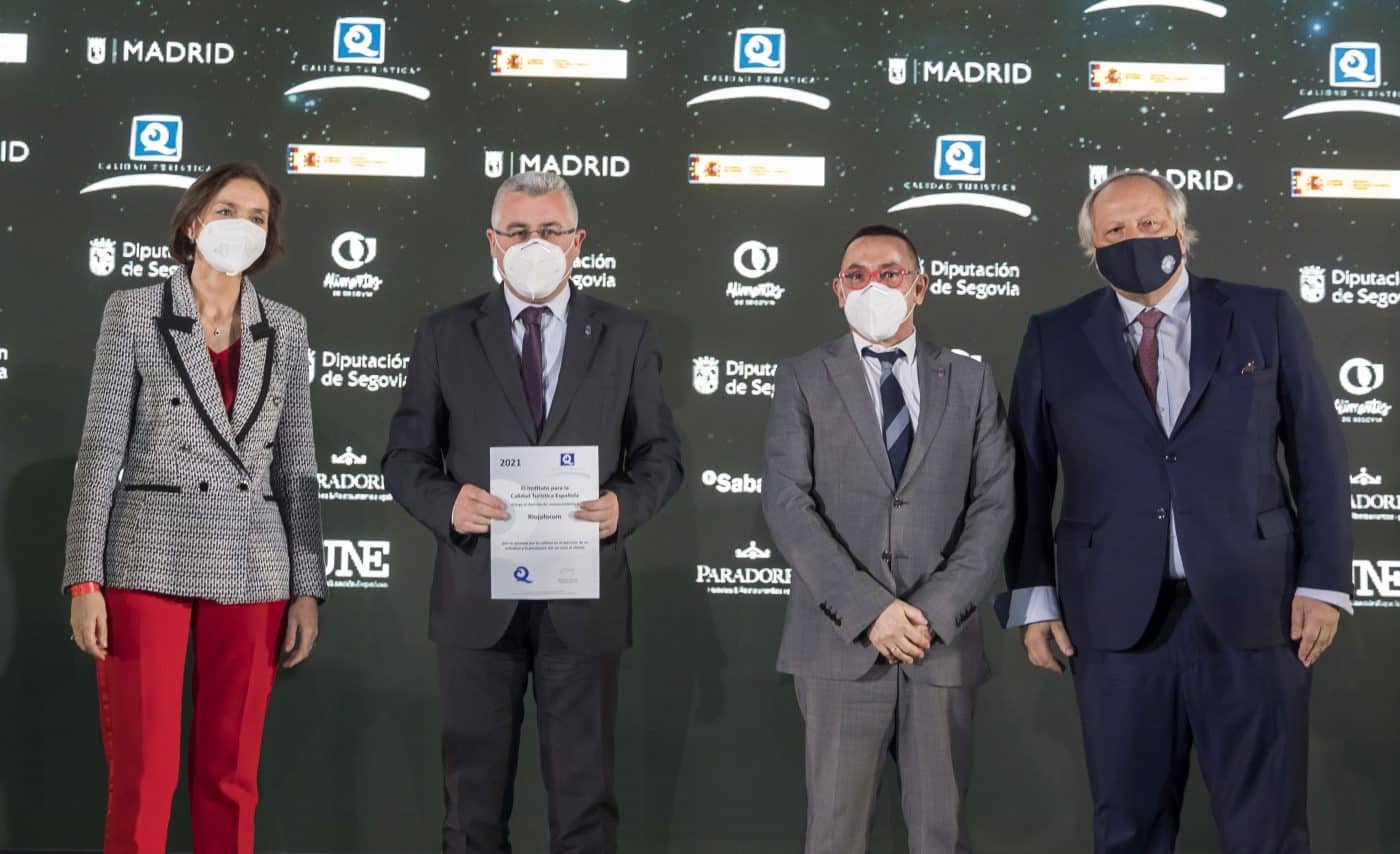 Anoche, en la gala de los Premios ‘Noche Q 22’, presidida por la ministra de Industria, Comercio y Turismo, Reyes Maroto, el consejero de Desarrollo Autonómico, José Ángel Lacalzada, y el director general de Turismo, Ramiro Gil, recibieron el diploma reconocimiento a Riojaforum. Palacio de Congresos de La Rioja por su apuesta por la calidad en el ejercicio de su actividad y la prestación del servicio al cliente. Otorgados por el Instituto para la Calidad Turística Española (ICTE), estas distinciones tienen el objetivo de reconocer a personas, empresas o instituciones que hayan destacado por la promoción de la calidad turística.