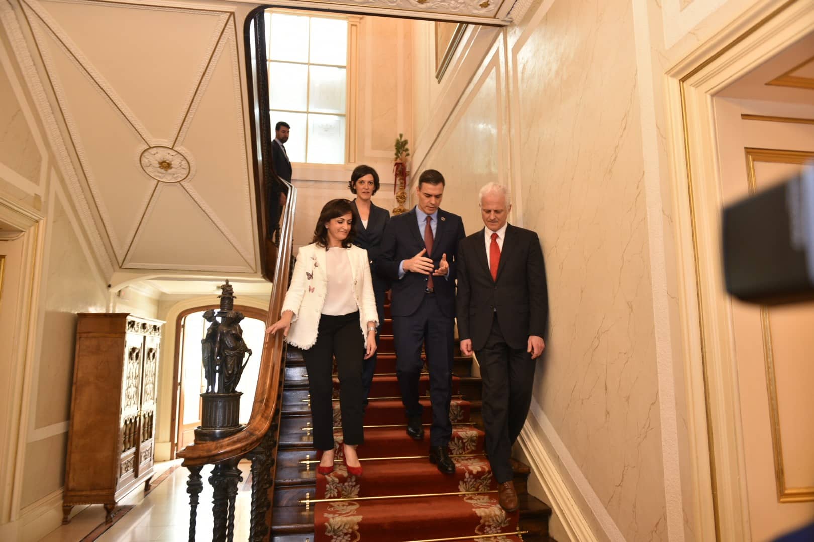 Pedro Sánchez y Concha Andreu se saludan a la entrada del Palacete del Gobierno | Foto: Gobierno de La Rioja