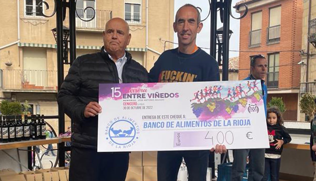 El pasado domingo, 30 de noviembre, la Carrera Entre Viñedos, organizada por el Club Maratón Rioja en la localidad de Cenicero, con salida y llegada en el pueblo, sirvió también para que los corredores demostraran su solidaridad con la sociedad, de forma que su presidente, Manel Vergara, hizo entrega al responsable de Eventos del Banco de Alimentos de La Rioja, Carlos Ferrer, de un talón por valor de 400 euros, que fueron parte de lo recaudado entre las inscripciones. En la Carrera Entre Viñedos participaron 741 atletas senior, junto a una veintena de chavales en la carrera infantil.