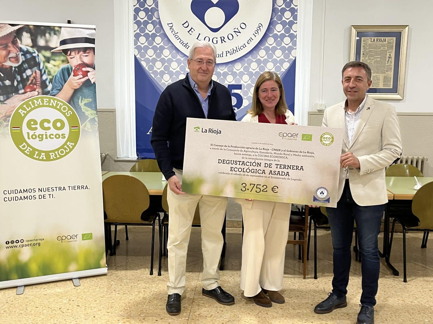 El presidente del Consejo de la Producción Agraria Ecológica de La Rioja, Javier Allo y la consejera de Agricultura, Ganadería, Mundo Rural y Medio Ambiente, Noemí Manzanos han entregado esta mañana la cantidad de 3.752 euros a la Cocina Económica. Se trata de la recaudación íntegra de la degustación de ternera ecológica asada celebrada el pasado 28 de septiembre en el Ecomercado de Logroño con motivo de las fiestas de San Mateo.