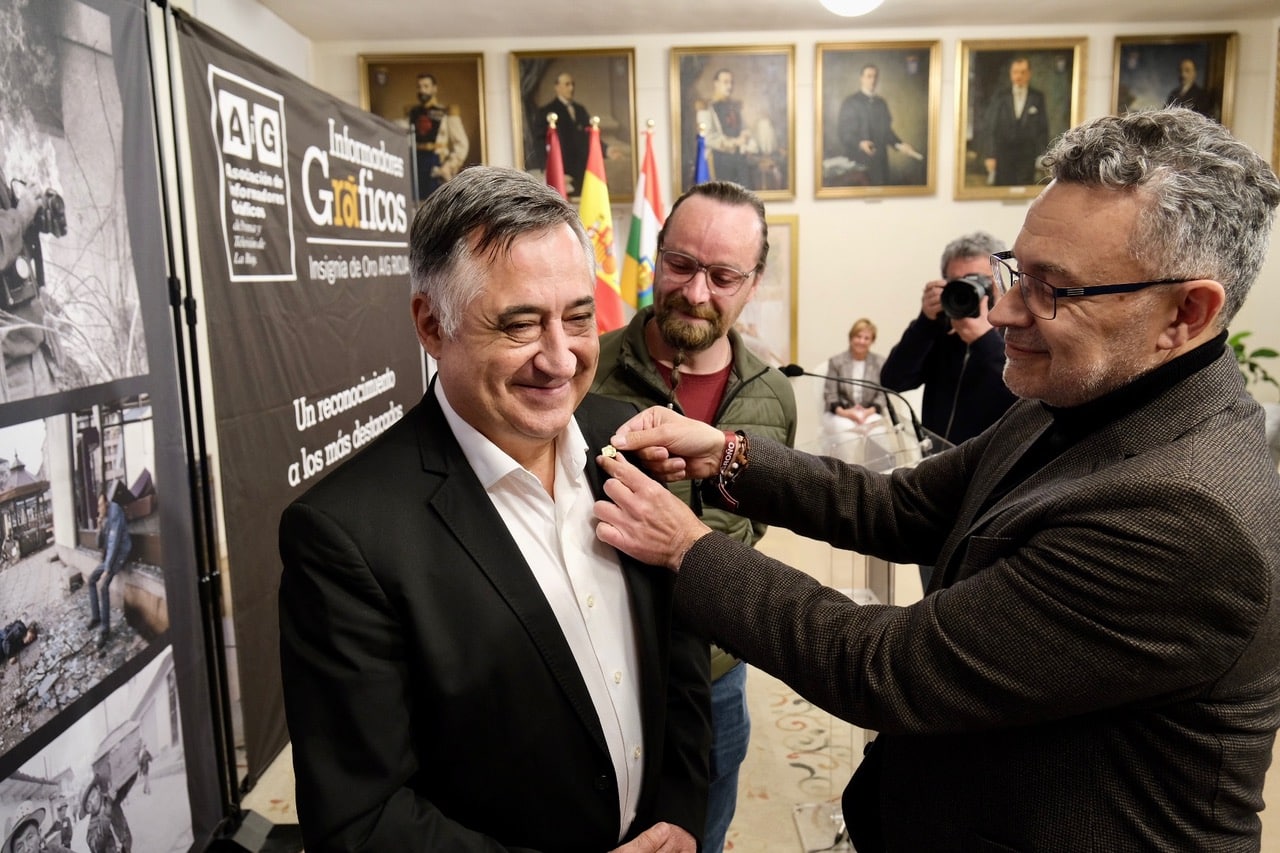 El alcalde de Logroño, Conrado Escobar ha entregado Gervasio Sánchez la insignia de la AiG en un acto celebrado en el Salón de Retratos del Ayuntamiento en la que ha destacado “su importante papel en la evolución del fotoperiodismo, así como su gran labor informando a través de su objetivo a lo largo de más de tres décadas. “Un reconocimiento que, además, distingue la valentía y la audacia de un profesional que, con sus fotografías y reportajes, ha informado sobre varias guerras en distintas partes del mundo y le han llevado a convertirse en el fotoperiodista de guerra español más conocido internacionalmente”, ha añadido Conrado Escobar.