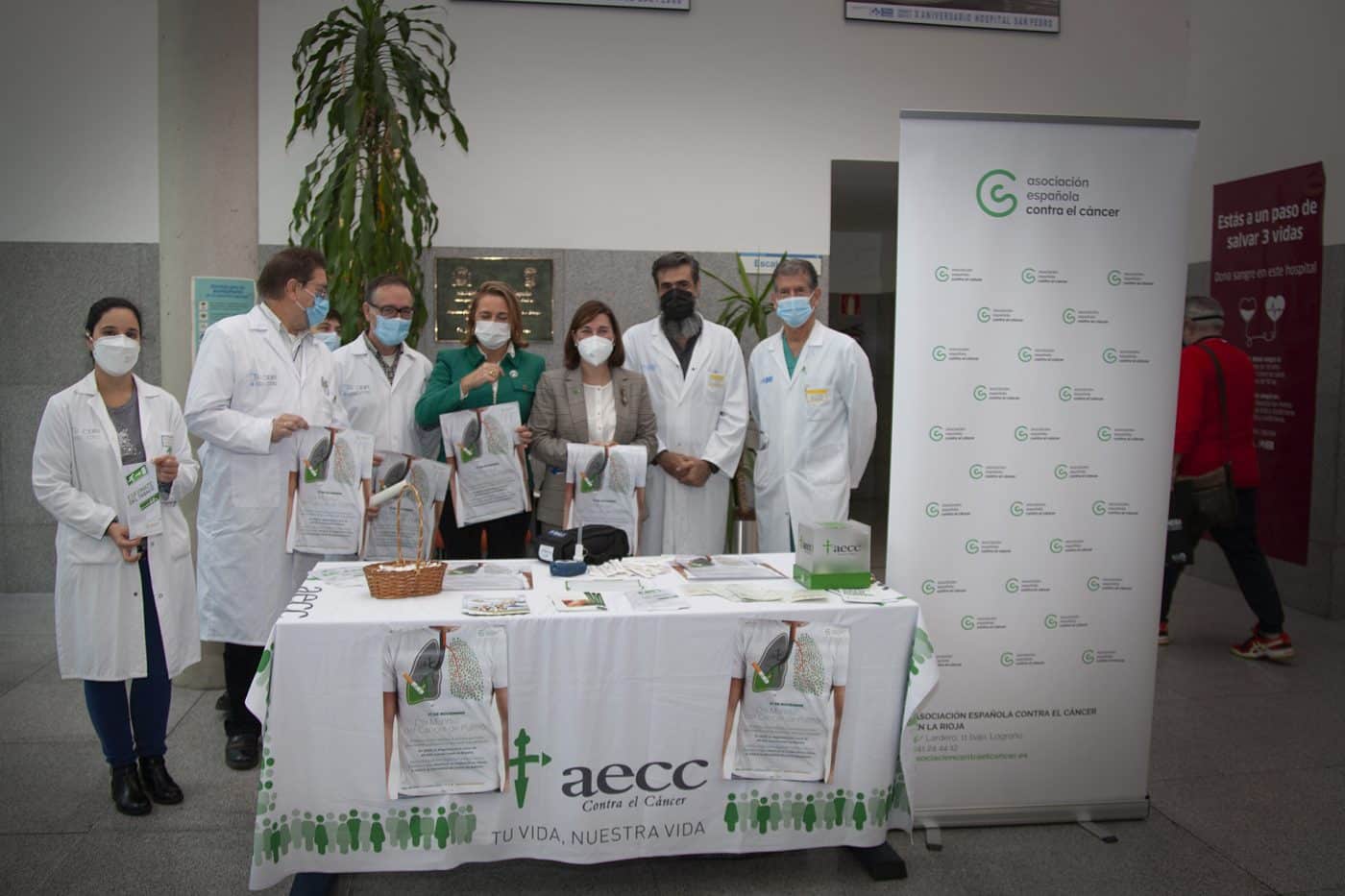 La consejera de Salud, Sara Alba, acompañada por la presidenta de la Asociación Española contra el Cáncer en La Rioja, Elena Eguizábal, y por el director médico del Hospital San Pedro, Adolfo Calvo, ha visitado esta mañana la mesa informativa de la AECC en el Hospital San Pedro con motivo del Día mundial del Cáncer de Pulmón.