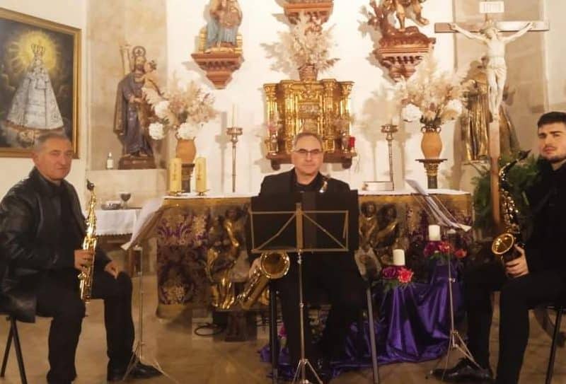 La parroquia de Santo Tomás ha acogido el acto de presentación del programa de Semana Santa de la Cofradía de la Santa Vera Cruz que ha contado con una actuación del Trío de Capilla Amalgama y un espectáculo de luces
