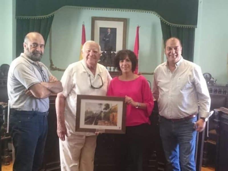 La alcaldesa de Haro, Laura Rivado, acompañada por los concejales Javier Redondo y Leopoldo García, ha entregado al actor una lámina firmada por José Uríszar