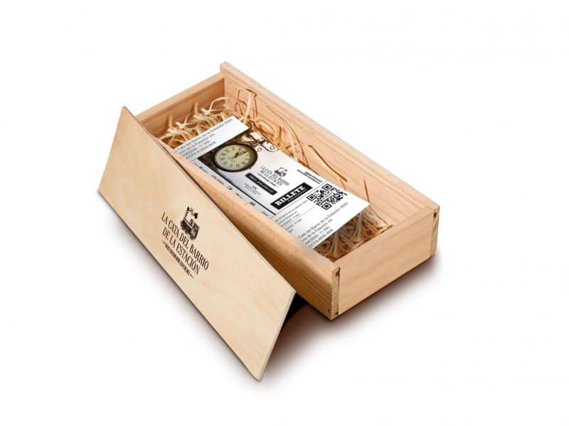 Una elegante caja de madera, similar a las de las botellas de vino, donde se encuentra la entrada para subirse al tren del mejor vino de La Rioja