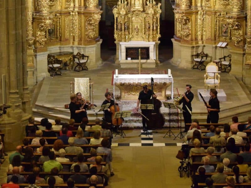 Músicos de la asociación Rioja Filarmonía protagonizaron tres conciertos en los entornos del Palacio de las Bezaras, El Torreón y la plaza de la Paz, y un último como colofón en el interior de la parroquia de Santo Tomás