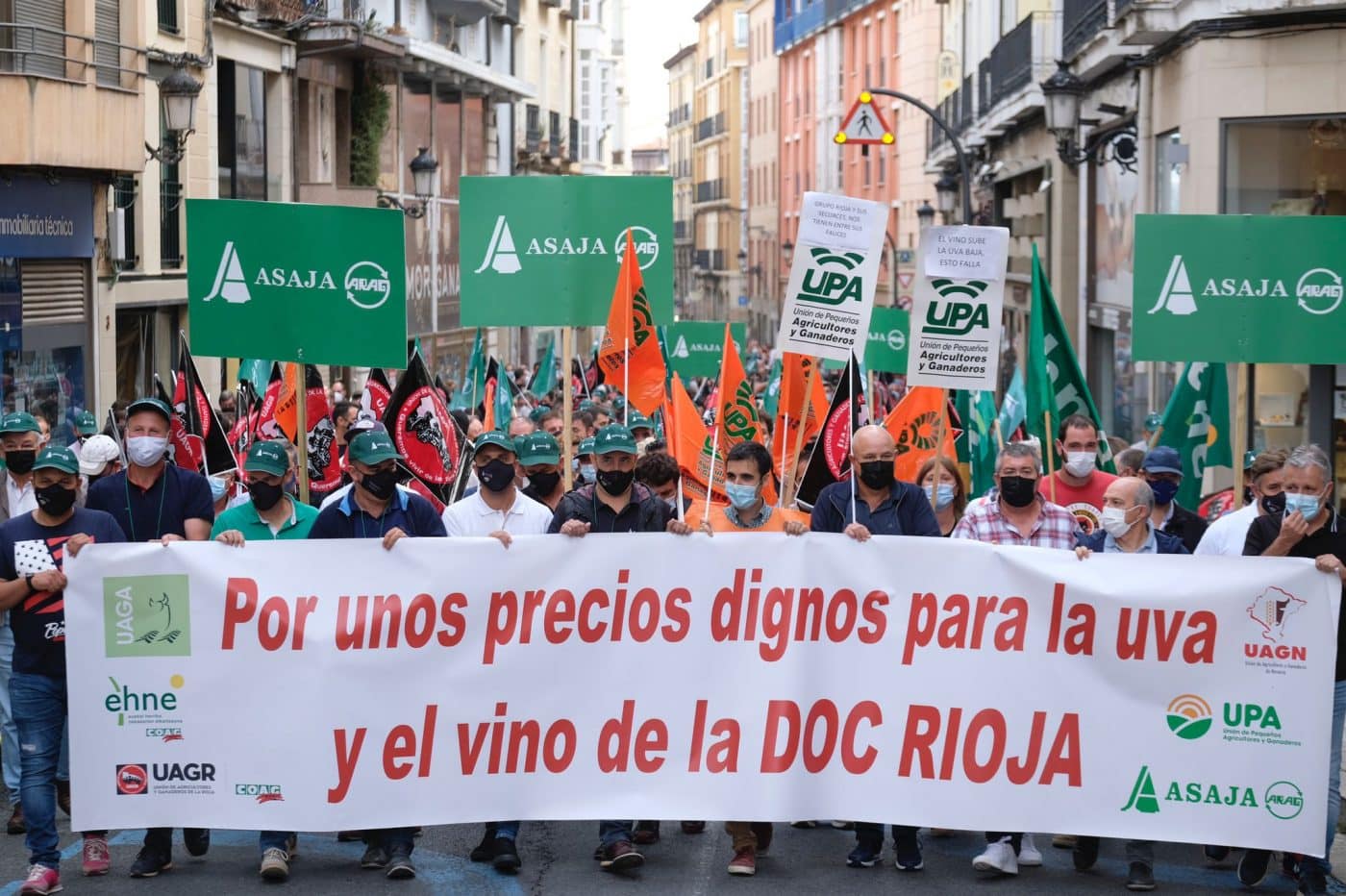 Cerca de 1.000 viticultores se han manifestado este miércoles por las calles de Logroño para exigir “precios dignos” para la uva y el vino de la DOCa Rioja. “Los viticultores producimos calidad y también queremos que nos la paguen”, han destacado durante esta manifestación que ha comenzado en la plaza del Mercado para finalizar frente a la sede de la Delegación del Gobierno en La Rioja. Allí, miembros de ARAG-ASAJA, UAGR-COAG, UPA Rioja, UAGN, UAGA y EHENE-COAG, presentando a viticultores de La Rioja, Euskadi y Navarra, han leído un manifiesto en el que han destacado que la situación es “inadmisible: una crisis de precios que empezamos el año pasado y puede que este año se repita y tienda a cronificarse”.